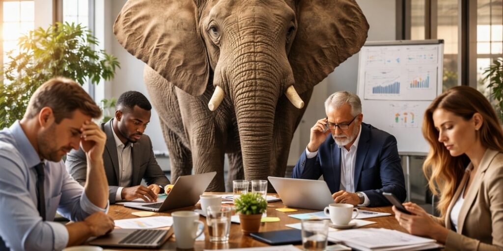 L’expression « the elephant in the room » est très imagée. Elle décrit une situation où un problème évident est présent, mais que personne n’ose aborder. Tout le monde en a conscience, pourtant le sujet reste volontairement ignoré.
