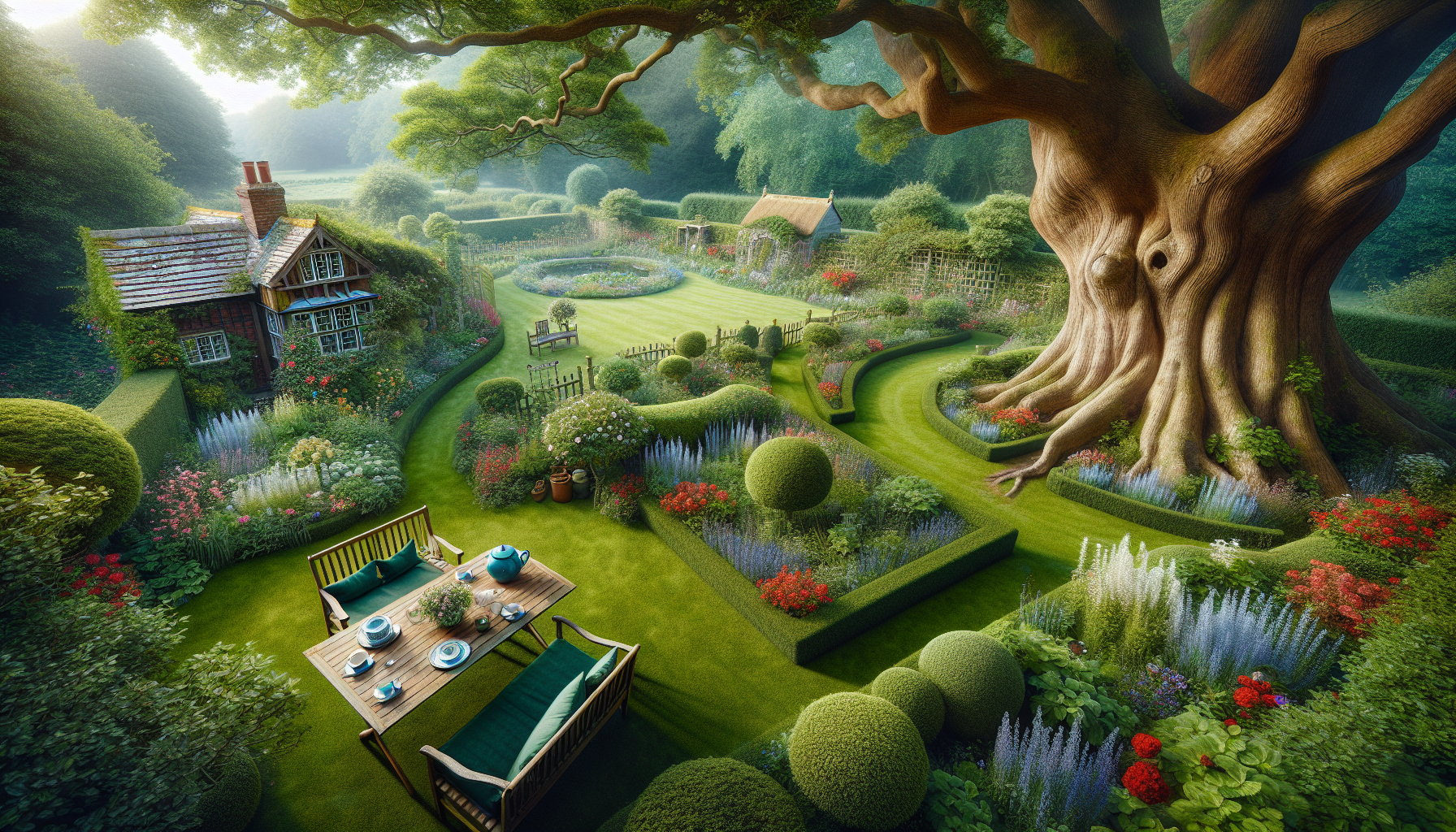 Le fameux tea time, rituel sacré en Angleterre, trouve souvent son écrin dans le jardin, surtout durant les beaux jours. Une table dressée sous un cerisier en fleurs ou au bord d’une pelouse invite à savourer un thé accompagné de scones, clotted cream et confiture maison.