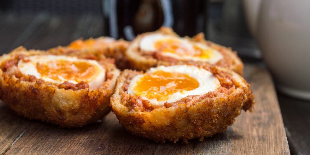 Le scotch egg est un œuf dur entouré de chair à saucisse et pané. Il est ensuite frit ou cuit au four. Ce snack est très populaire dans les marchés britanniques. Il peut être dégusté chaud ou froid. Il est pratique à emporter.